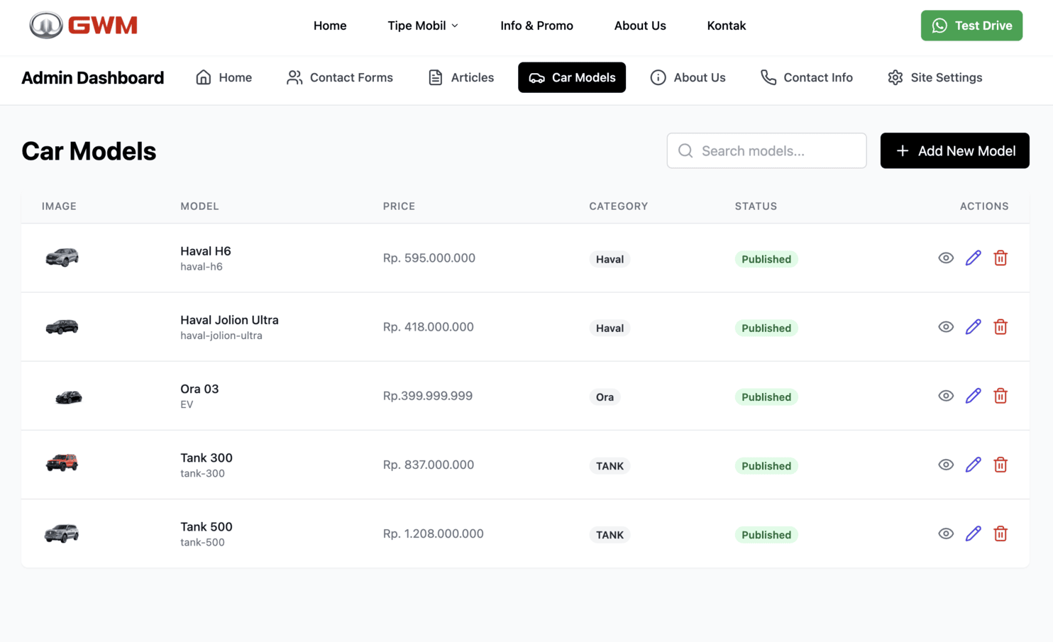 - Form Inquiry Management: Track and respond to lead submissions, with status tracking (e.g., “new”, “contacted”).