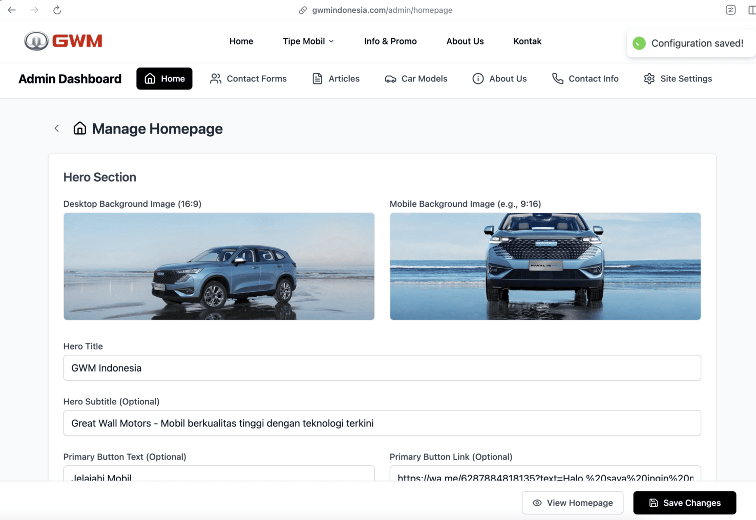 - Update WhatsApp link, company phone, address, and social media links (Facebook, Instagram, X, YouTube).
